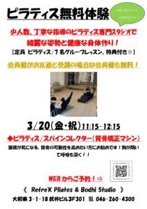 無料体験出来ます!2026年3月20日(金・祝) 2026/02/27 news ピラティス/スパインコレクター/11:15~12:15 定員7名、当スタジオのご利用が初めての方は1レッスン無料で体験いただけます。 WEBからご予約ください。